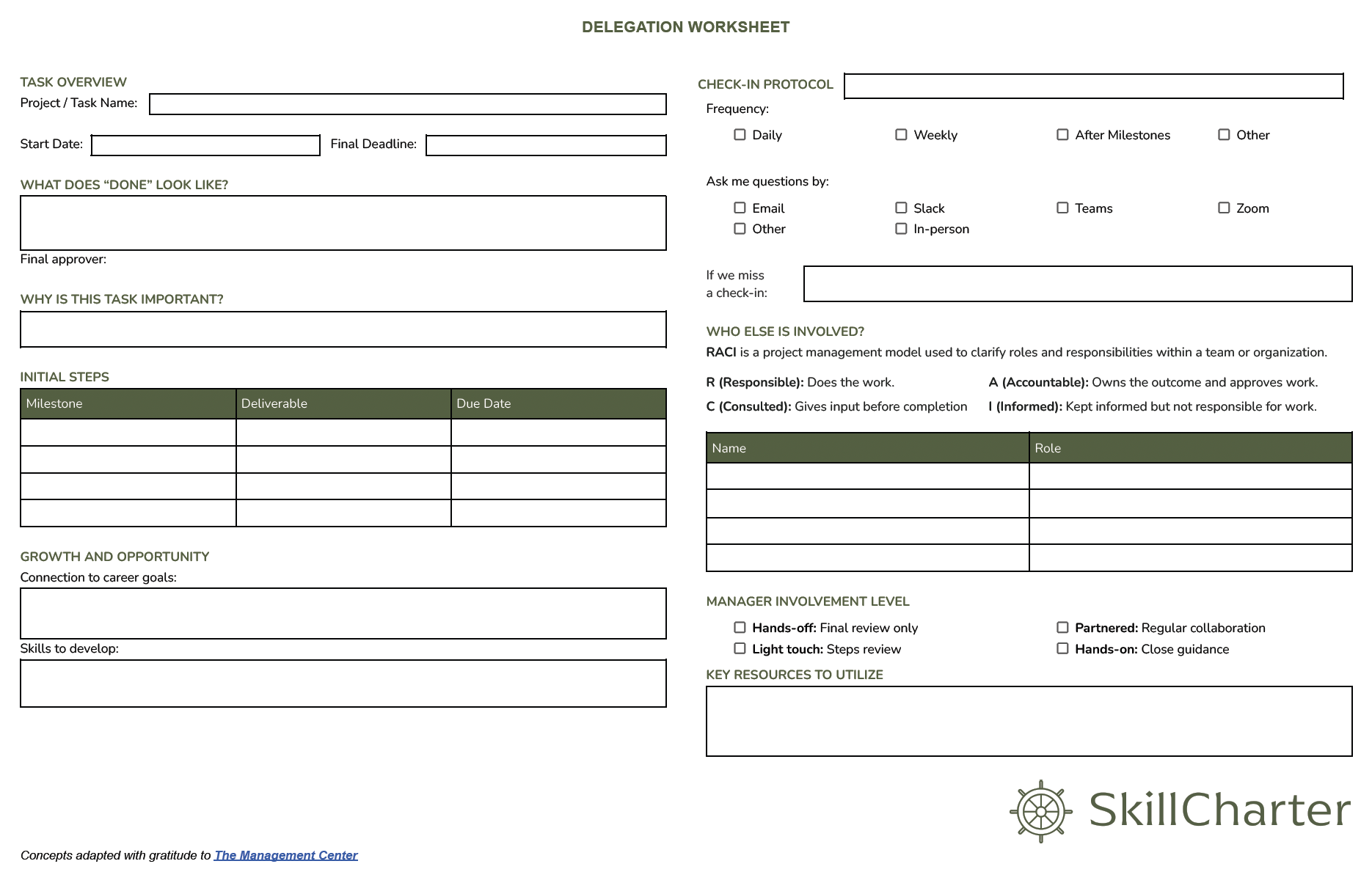 It is built on the five W’s of delegation (Who, What, When, Where & Why) plus a little bit of How.
